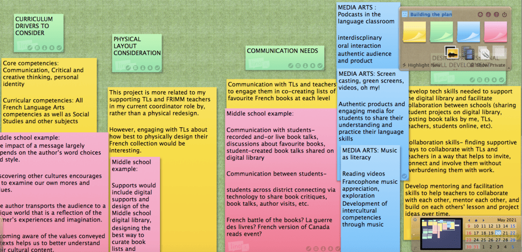 The Media Arts additions to my Linoit board include integrating podcasts into French language or cross-disciplinary projects, supporting music in the language classroom as a tool to engage with literacy in French and explore diverse francophone voices, and using videos to create and share new understandings. While there are many aspects of Media Arts that can support language programs, these are the ones where I can imagine helping French teachers and students to use these media arts tools in supporting their language programs.