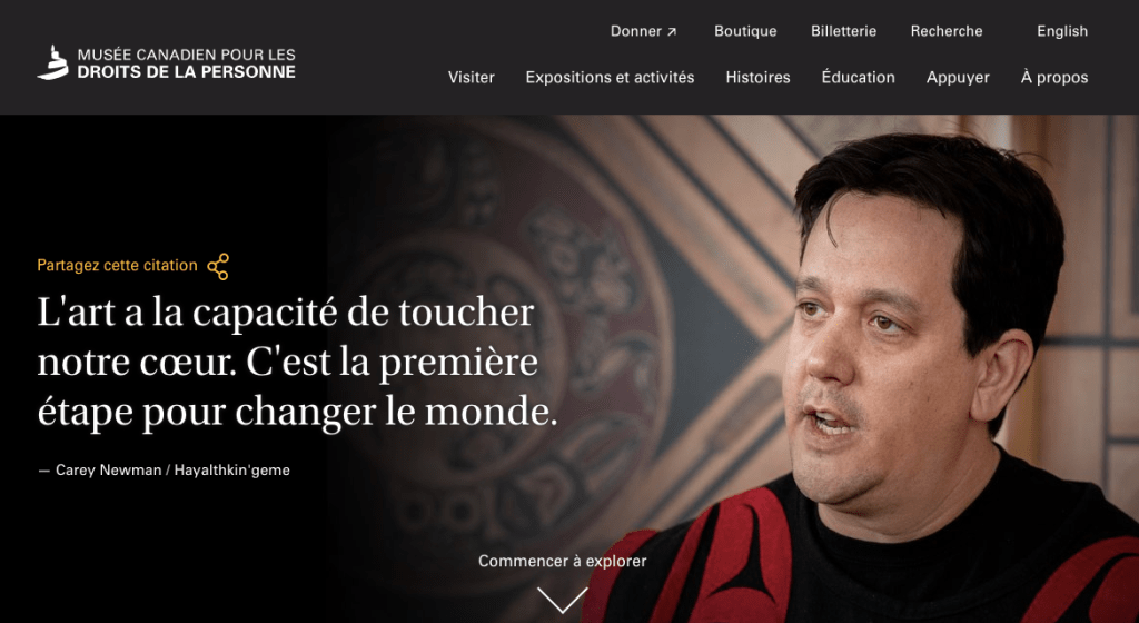 Musée canadien pour les droits de la personne: This human rights museum in Winnipeg has several virtual exhibits, including an upcoming exhibit called DéclART tes droits on Winnipeg students’ artistic interpretations of human rights. This could be a great catalyst for a local project of this nature for a grade 6 Socials class or a secondary class.