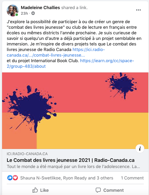 Based on the ideas I got from my research in English, I posed a question related to participating in or creating a regional or even international reading event such as a « Battle of the books » or « international book club » in French. Since I did not find one individual whose work I would like to follow, I reached out to a Canadian PLN « J’enseigne en immersion française » with the question or idea. I got a few likes, including one from an author friend, but so far the only comment was that it was a good idea. I hope to hear from someone who knows of an established project or who would like to collaborate on this.