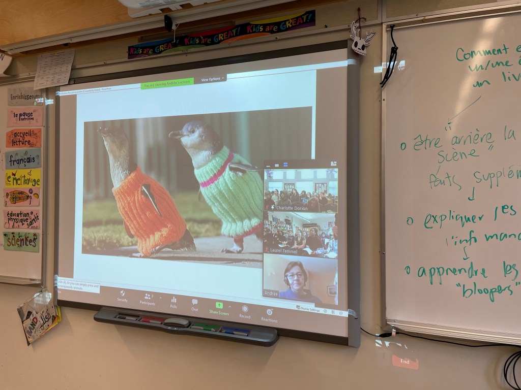 We had Andrée Poulin back this fall and winter to do virtual visits and I attended one of them. While I must say it was not quite the same experience as having her in our classrooms, it still really motivated the students in classrooms across our district. The benefit was that we were able to offer this to more classes for far less cost and a negligible carbon footprint as compared to her in person visit one year prior.