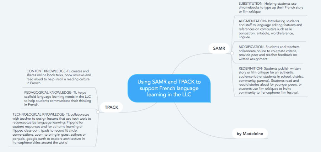 I chose to focus on how TPCACK an SAMR models can be implemented in the LLC to support language learning across all subject areas. While my focus is Core French and French Immersion programs, I am wondering if teachers in an English classroom see the tools, approaches and tasks mentioned as being pertinent to their first language and ELL context?